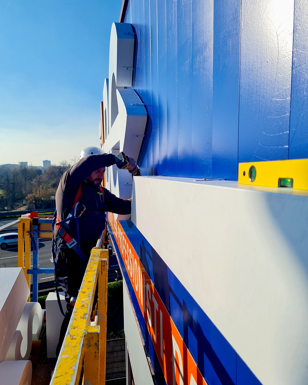 Il montaggio è stato eseguito con particolare attenzione all’allineamento, alle proporzioni e alla corretta fissazione dell’insegna, per garantire: