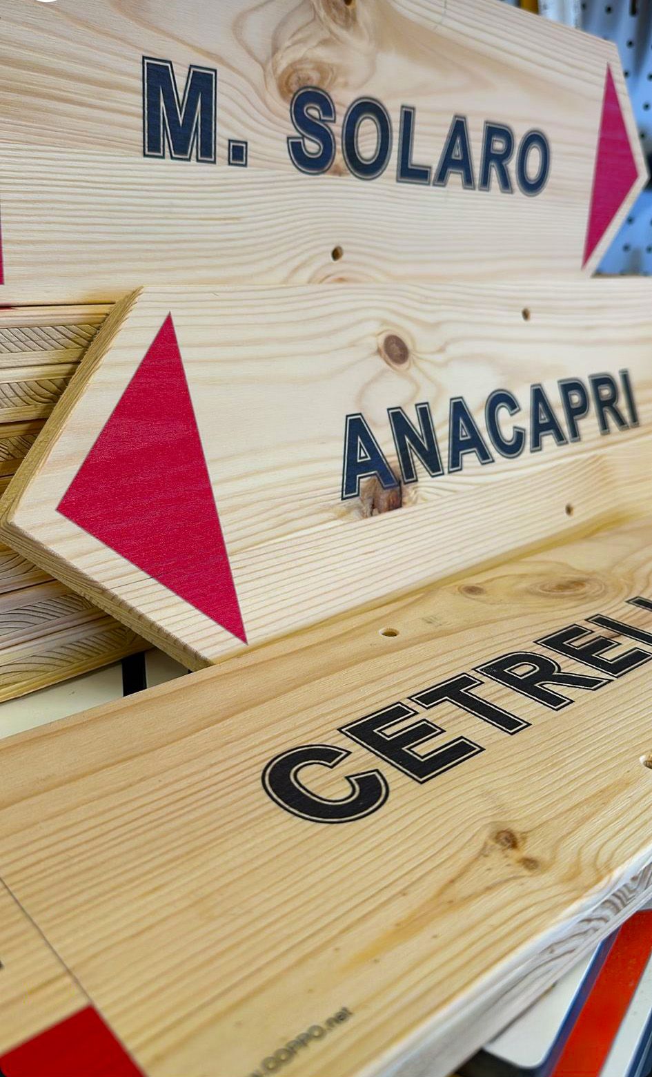 Alcune Regioni richiedono l’utilizzo del legno come materiale delle tabelle segnavia. Le nostre frecce in legno possono essere completamente incise o stampate nel caso si necessiti di loghi complessi o esigenze particolari.